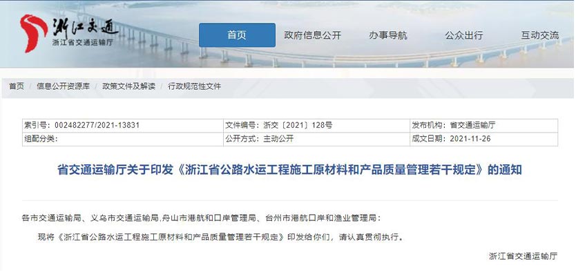 近日,浙江省交通運(yùn)輸廳制定出臺(tái)《浙江省公路水運(yùn)工程施工原材料和產(chǎn)品質(zhì)量管理若干規(guī)定》(以下簡(jiǎn)稱《若干規(guī)定》)。